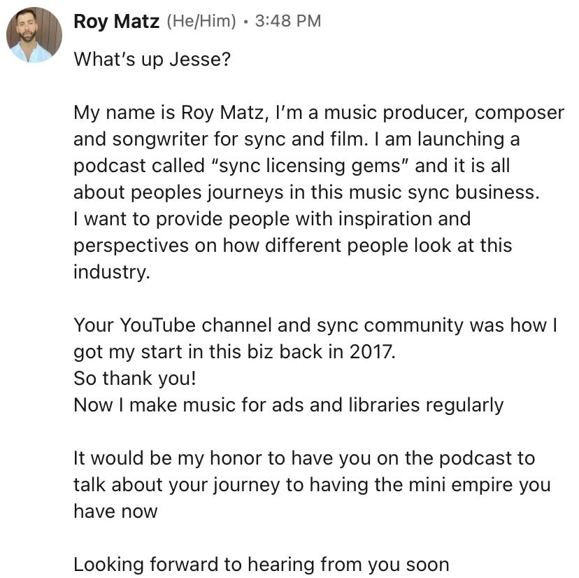 So cut to 2.5 years later, now not only do I have more to prove for my skills as a composer, I’ve also had over 80 guests on my podcast that have given me their time of day and dropped insane gems on me and my guests. Now not only am I confident in sending a follow up, I also suggest to go on Jesse’s pod.